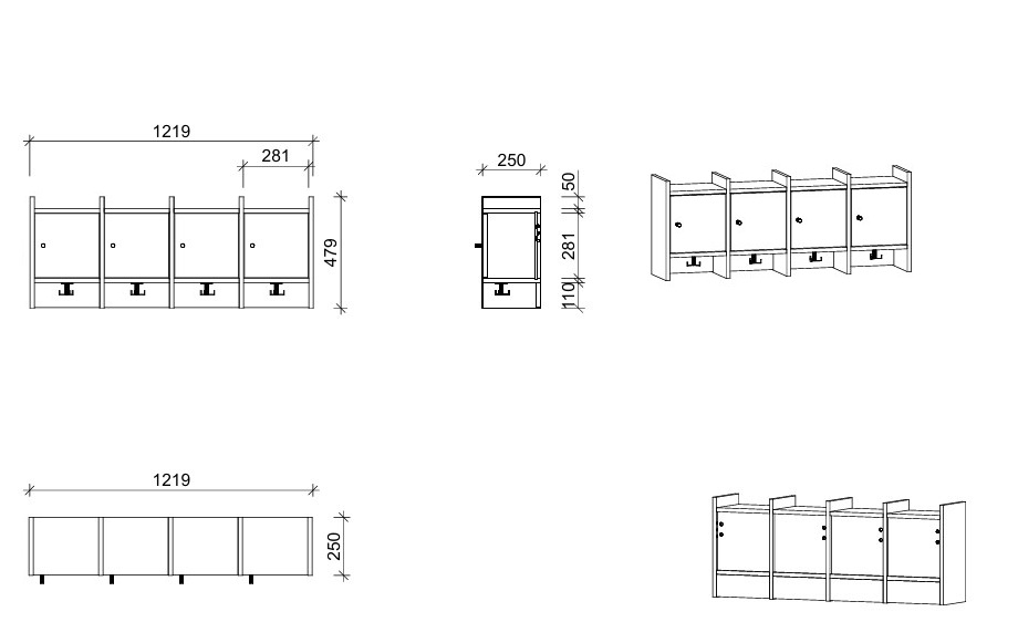 Garderobenablage | 4 Plätze und Tür rechts - Basic | 122 x 48 x 25 cm