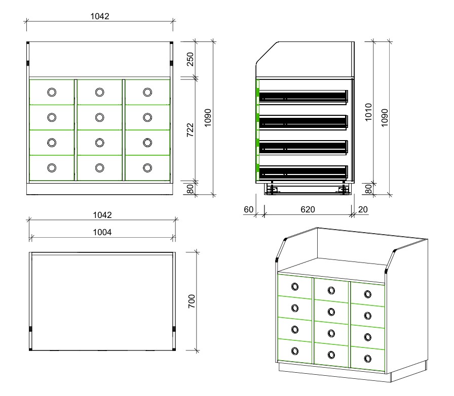 Gefertigt aus melaminharzbeschichteter Spanplatte mit langlebigen ABS-Kanten. Hochwertige Beschläge und stabile Auszugssysteme sorgen für eine dauerhafte Nutzung im professionellen Einsatz.