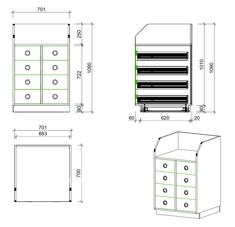 Gefertigt aus melaminharzbeschichteter Spanplatte mit langlebigen ABS-Kanten. Hochwertige Beschläge und stabile Auszugssysteme gewährleisten eine dauerhafte Nutzung im anspruchsvollen Alltag von Krippe und Kita.