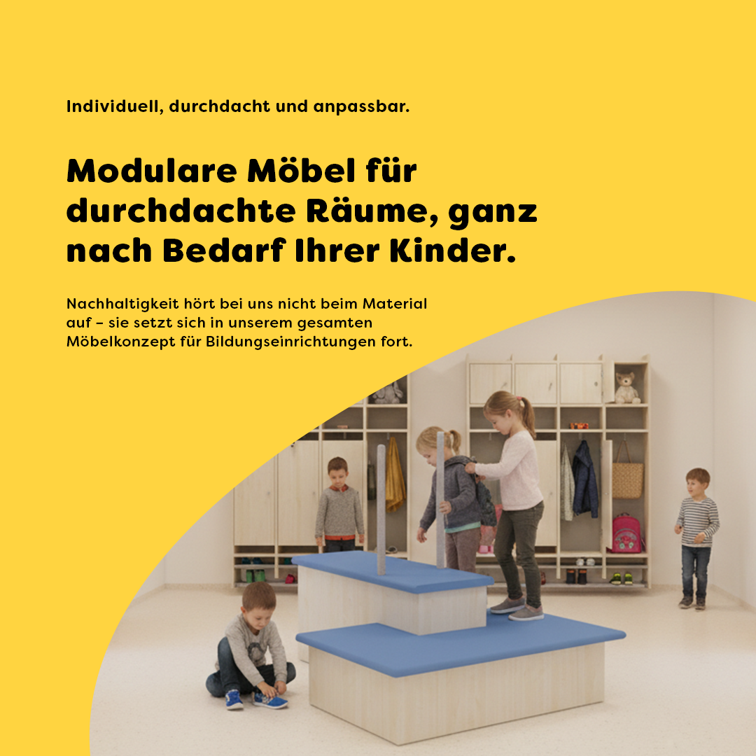 Nachhaltigkeit hört bei uns nicht beim Material auf – sie setzt sich in unserem gesamten Möbelkonzept für Bildungseinrichtungen fort.