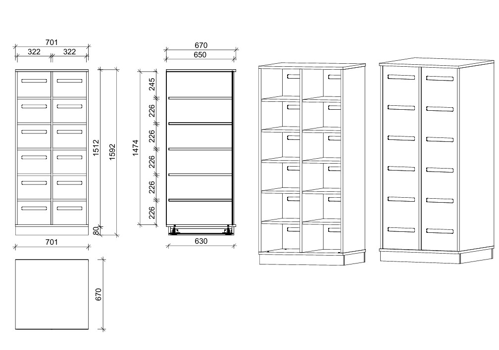 Mit seinen Maßen von 70 × 159 × 67 cm (BxHxT) bietet das Regal eine hohe Kapazität bei effizienter Nutzung der Raumhöhe. Die 12 Fächer ermöglichen eine klare Zuordnung von Schlaftextilien für mehrere Kinder.
