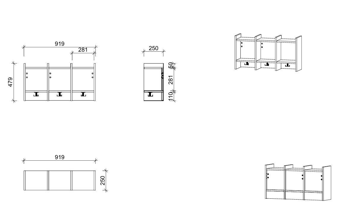 - wandhängende Garderobenablage mit 3 Garderobenplätzen