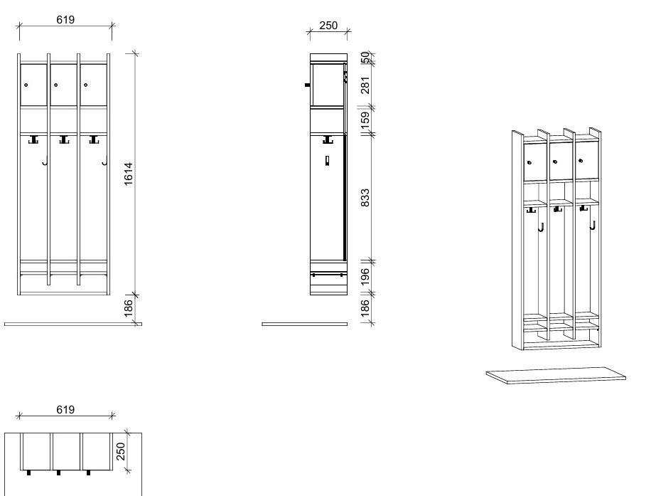 Spindgarderobe | 3 Plätze und Tür rechts - Basic | 62 x 161 x 25 cm
