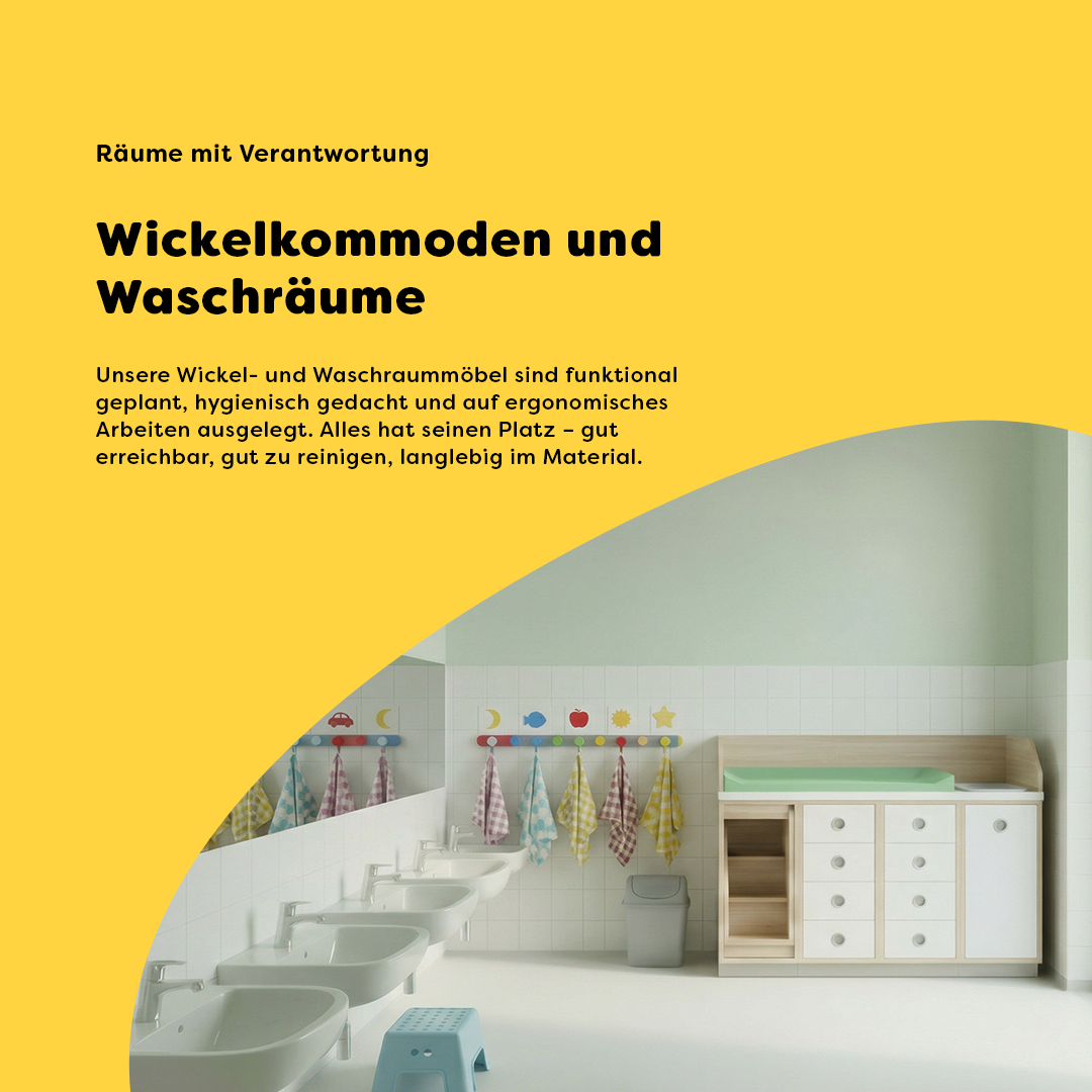 möbelinio Wickelsystem Pflegebereiche strukturieren, Abläufe vereinfachen: Das Wickelsystem von möbelinio ist speziell für die Anforderungen in Krippe und Kita entwickelt. Es verbindet sichere Wickelsituationen mit klar organisierter Aufbewahrung. Durchdachte Stauraumlösungen sorgen dafür, dass Pflegeutensilien griffbereit, geschützt und übersichtlich angeordnet sind. So entstehen ruhige, verlässliche Abläufe im Alltag. Gedämpfte Schubladenauszüge mit Softclose unterstützen eine leise Nutzung im sensiblen Pflegebereich. Der austauschbare Sockelrahmen ermöglicht eine langfristige Nutzung auch bei hoher Beanspruchung. Die Ausstattungslinien reichen von vorkonfigurierten Lösungen bis hin zu individuell geplanten Wickelanlagen für komplexe Raumanforderungen. Wickelkommode 12 Schubladen – Basic Strukturierte Pflege, sicher organisiert: Diese Wickelkommode kombiniert eine integrierte Wickelfläche mit großzügigem Stauraum und unterstützt ruhige, effiziente Abläufe im Wickelbereich. Ausstattung & Funktion Wickelkommode mit 12 Schubladen zur strukturierten Aufbewahrung von Pflege- und Wickelmaterialien kugelgelagerte Schubladen mit Vollauszug für vollständigen Zugriff gedämpfte Softclose-Funktion für leises und sicheres Schließen integrierte Schubunterteilungen für übersichtliche Organisation geschützte Aufbewahrung für Windeln, Pflegeprodukte und Textilien stabile Konstruktion für den Einsatz im Wickel- und Pflegebereich austauschbarer Sockelrahmen für langlebige Nutzung bei hoher Beanspruchung melaminharzbeschichtete Oberfläche für den intensiven Alltagseinsatz robuste ABS-Kanten mit gerundetem Radius Nutzung im Alltag Die Kombination aus Wickelfläche und strukturierter Stauraumlösung ermöglicht eine klare Organisation aller Pflegeutensilien. Materialien sind jederzeit griffbereit und unterstützen ruhige, sichere Abläufe während der Pflegesituation. Die gedämpften Auszüge sorgen für eine geräuscharme Nutzung – besonders wichtig in sensiblen Pflegesituationen. Gleichzeitig erleichtert die klare Struktur das Aufräumen und Wiederfinden von Materialien. Maße Breite: 104 cm Höhe: 109 cm Tiefe: 70 cm Material & Qualität Gefertigt aus melaminharzbeschichteter Spanplatte mit langlebigen ABS-Kanten. Hochwertige Beschläge und stabile Auszugssysteme sorgen für eine dauerhafte Nutzung im professionellen Einsatz. Gestaltung & Dekor Erhältlich in den Korpusdekoren Weiß, Lichtgrau, Sandahorn, Buche hell oder Eiche natur und damit optimal kombinierbar für stimmige und ruhige Raumkonzepte in Bildungseinrichtungen. Die Fronten und Zubehör wählen Sie entsprechend ihrem individuellen Farbkonzept. Besonderheiten Softclose-Schubladen serienmäßig austauschbarer Sockelrahmen strukturierte Pflegeorganisation geeignet für intensive Nutzung im Wickelbereich